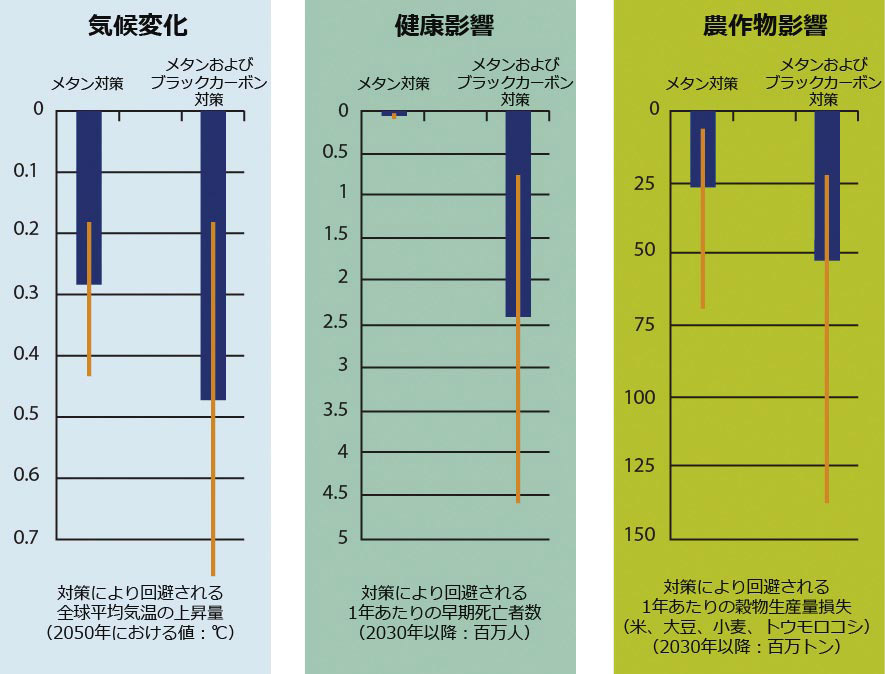 2011年に発表されたUNEPとWMOの報告書では、SLCPsの削減によるそうした多面的な便益が、数値モデルを用いて定量的に検討されています(図1)。この図は化石燃料採掘時のメタン回収強化などのメタン排出抑制策を行った場合と、それに加えて、途上国における調理用ガスストーブの利用促進などのブラックカーボン排出抑制策を行った場合の全球気温(2050年)、早期死亡者数(2030年以降)、穀物収穫量(同)を、何も対策を行わなかった場合と比較して示したものです。メタンとブラックカーボンの排出抑制策を両方とも講じた場合、2050年における全球気温の上昇量は約0.5℃(0.2-0.7℃)も抑えられ、これに加えて、主としてブラックカーボンの減少によって、心臓病や肺がんによる早期死亡者(平均寿命より早く死亡する人)の数が約240万人(70-460万人)減少し、穀物収穫量の損失が約5200万トン(3000-14000万トン)減少すると評価されています。