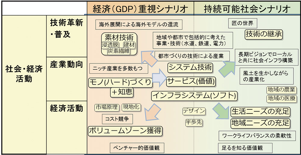 経済重視シナリオ(図2の左側のシナリオ)では、GDP成長を促す大量生産の需要が見込めるボリュームゾーンを獲得して儲けるために海外へ展開することに力が入れられ、海外展開による海外モデルの日本への還流によって日本の技術力を維持します。一方、モノは市場原理によるコスト競争が激しいので、如何にニッチ産業を多数持つかが重視され、世界の需要を日本が独占できるような市場規模の製品を日本が担当しています。ベンチャー的価値観によって、技術革新による素材技術の市場を開拓する等の急成長分野を見出しています。