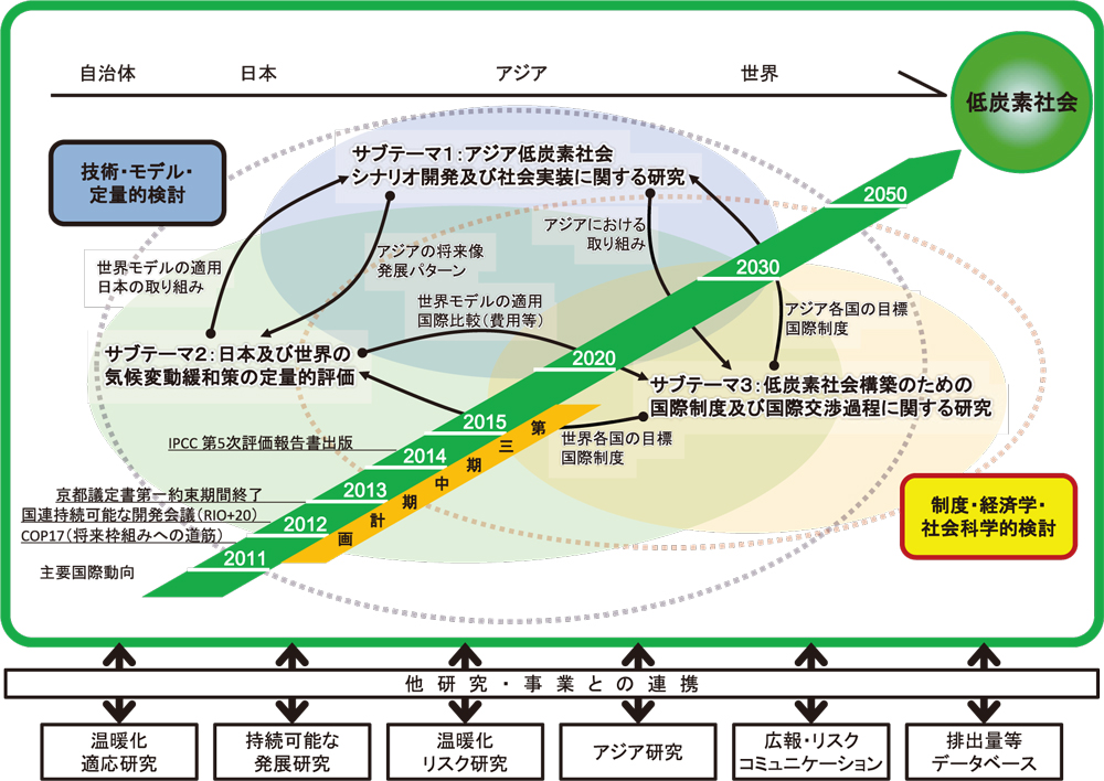 低炭素社会の実現に向けた取り組みを支援し、さらに加速させるために、以上の3つのサブテーマが連携して取り組んでいます。このほか、地球温暖化研究プログラムPJ2「地球温暖化に関わる地球規模リスクに関する研究」とは温暖化影響や適応策を含めたモデル開発や分析を、持続可能社会転換方策研究プログラムとは低炭素社会を含めた持続可能な社会の実現に向けた取り組みの検討を、それぞれ連携して行っています。