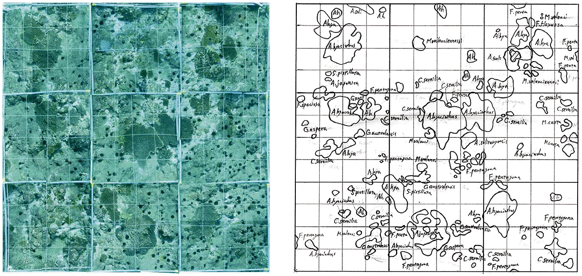 モニタリング調査は、海に潜って初年度に設置した方形区画の場所を探すところから始まります。目印として区画の四隅に打ちつけている小さな丸カン(先が環状になった金属製のクイ)を見つけ出し、12mロープで3m×3mの方形区画を復元したら、区画内のサンゴの記録の開始、コドラートの出番です。まず、方形区画内を9分割し、コドラートをその各1m2の小区画に置いていきます。次に、コドラート内に50cm四方に張られたタコ糸を目安に小区画内を4分割し、水中カメラを使ってそれらを真上から撮影します。次に、コドラート内に25cm四方に張られたタコ糸を目安に、小区画内のサンゴ群体の輪郭と種名を耐水紙にスケッチしていきます(写真3)。こうして得られた写真とスケッチをもとに、全区画内のサンゴマップを作成し(図1)、サンゴの種数、種構成、群体数や被度を求めていくのです。写真を見た限りでは、この作業は一見簡単そうに見えるかもしれません。しかし、体幹に10kg近いおもりを装着して、潮流がある中、コドラートの真上で中性浮力(浮かず沈まずの状態)を維持し、1時間以上写真撮影やスケッチを続ける作業には、非常に高いスキルと根気が必要です。また、金槌などの重い調査機材や水への抵抗が大きいコドラートを持って、海岸や船上から調査区画まで泳いで移動するのにも、かなりの体力を消耗します。さらに、私が楽しくスケッチしている間、寒さを我慢しながら海底でヒラメのようにじっとコドラートを持ち続ける私の所属研究室のボスには、並みはずれた忍耐力が要求されます(写真3の左方)。