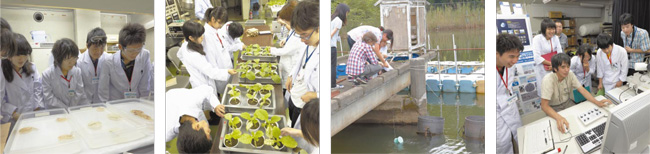 7月下旬、急に夏らしい陽射しが強まり始めたころに「環境と生物」プログラムの「オゾンの植物影響」と「多様な藻類の観察」の2コースを実施しました。「オゾンの植物影響」では、実験用植物に光化学オキシダントの原因物質であるオゾンを曝露したときの様子から、可視障害が品種によって大きくことなることを観察し、植物の環境ストレスに対する防御機構が多様化していることを実験しました。また「多様な藻類の観察」では、研究所内の池で採取した藻類試料と、所内で保存している藻類株を観察して、藻類の多様性の理解と分離、培養、保存技術について体験し、藻類の作ったオイルの抽出実験から藻類の有用性についても学びました。両コースとも電子顕微鏡やガスクロマトグラフィーなど、普段は使わない実験装置などに苦労しつつも、参加者同士が助け合いながら実習に取り組み、無事に結果をまとめることができました。
