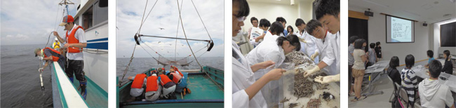 「東京湾の魚介類と環境~本当の姿を実体験!~」プログラムでは、横浜市漁業協同組合のご協力を賜り、東京湾内の2地点において水質観測と魚介類のサンプリング(底曳き網)を行いました。同じ湾内でも地点や水深によって水質や環境が異なることを観察し、そこに棲む生き物の違いなどを実体験しました。底曳き網で採れたサンプルは、翌日研究所内で種別等の同定を行いました。時期は8月、一晩経った魚介類のにおいも忘れられない経験となったことでしょう。参加した高校生たちは、時折行き交う船からの波をうけての魚介類の採集や、終日立ったままでの同定作業、多くのデータを分析しまとめる作業など、教科書で学ぶ理科の授業とは全く異なる4日間に満足した様子でした。高校生からは「研究者って地道なんだなぁ」という声も聞かれました。
