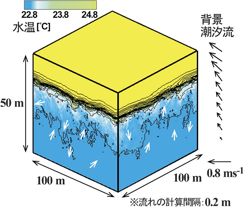 一方で、現場調査のみで時々刻々変化する乱流の様子を完全に把握することは大変困難であるため、筆者らは、このようにして観測された乱流のふるまいをLESの手法を用いて数値的に再現するための研究も進めています(図4)。LESとは乱流の数値シミュレーションのための手法の一つで、1960年代以来、気象学などの分野で利用されてきましたが、海に対する利用は世界的に見ても1990年代以降であり、我が国での利用も大変限られてきました。このLES手法が対象とする計算領域は水平・鉛直ともにせいぜい数100mであり、流れを計算するための空間間隔も数10cm程度です。広域数値シミュレーションにおける流れの計算の間隔が細かい場合でも数km程度であることと比べれば、非常に細かいスケールで計算を行っていることがわかります。また、先に紹介した乱流の観測情報と比較することでこの数値シミュレーション手法の信頼性を高めることが可能であることが本研究の強みです。このようにしてLESから得られたきわめてユニークな高解像度の海洋乱流データベースを用いることで、乱流諸量のふるまいを直接検証するという、従来のデータでは困難だった「ミクロな」観点まで踏み込んだ乱流パラメタリゼーション手法の高精度化の研究を進めています。