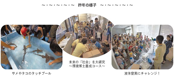 普段はご覧になることの出来ない研究施設の公開や回収された小型家電に含まれる金属含有量について学ぶ体験コーナー、サメやタコなど磯の生き物に触れることのできるタッチプール、PM2.5について考える展示や体験、環境に関するクイズ、来場者の方々と対話する「ココが知りたい生パネル」、「化学物質と健康」と題した講演会のほか、災害環境研究への取り組みの紹介など、子どもから大人まで環境問題を一緒に考えることのできるさまざまな企画をご用意しています。また、「絵画コンテスト」の作品展示および入賞者の表彰式も行います。