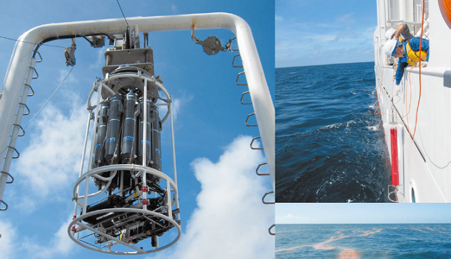 右下:陸棚(長江河口と九州の中間付近)の調査中に遭遇した夜光虫の赤潮です。