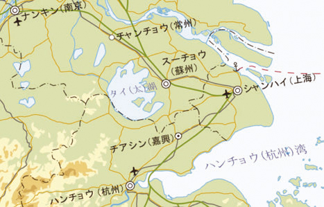 図1に国土地理院の地図「500万分の1日本とその周辺」から太湖の周辺部分を抜き出して示しました。太湖は上海市から100km程度西方に位置し、南北の長さが68.5km、東西の長さが34km、水面面積は2,338km2と大きく、平坦地にできた浅く広大な水たまりを想像させる中国第三の大きさの湖です。流域面積は36,900km2と広大で、約50%が平野で、霞ヶ浦と比較すると水面面積で約10倍、流域面積で約30倍となります。平均水深は1.9mであり、最深部でも2.7mと非常に浅いのも特徴です。流域には0.5km2以上の湖沼が189ヶ所存在する水郷地帯でもあり、「魚米の郷」と呼ばれています。