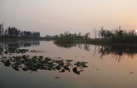 図2は昨年11月に撮影した太湖湖岸の夕景です。この場所は人工的に湿地を造成して、陸側からの汚濁負荷の低減を図るとともに、湿地公園として親水空間を提供することを目標としています。