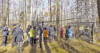 初日午後のスタディツアーでは、川崎市の環境関連施設(かわさきエコ暮らし未来館、資源化処理施設、川崎ゼロ・エミッション工業団地(三栄レギュレータ東京工場)、川崎市環境総合研究所)を視察し、公害から環境都市へと再生した川崎市の取組説明と質疑応答がなされました(写真5)。また4日目には、NIESの富士北麓フラックス観測サイト、環境省生物多様性センター、山梨県富士山科学研究所などを訪れました。韓国・中国の参加者は、温暖化や生物多様性などに関する様々な活動の説明を聴き、またフラックスタワーに登って設備を確認し、地球環境研究センターの担当者などと真摯な研究交流を行いました(写真6)。
