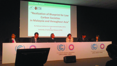 当研究所は、マレーシア工科大学(UTM)との共催で、「マレーシア及びアジア全域での低炭素社会実行計画づくりとその実践」と題するUNFCCC COP20/CMP10公式サイドイベントを12月11日に開催しました。このイベントでは、特にマレーシアのイスカンダル、プトラジャヤに焦点を当て、当研究所と京都大学が、国内外の研究協力機関との研究協力を通じ開発したアジア太平洋統合評価モデル(AIM)を用いた低炭素社会実行計画づくり、及びそれらの実践に関する最新の研究活動の成果を紹介しました。冒頭、外務省堀江正弘地球環境担当大使、及びUTMの国際室専務理事のNordin Bin Yahaya氏が歓迎挨拶を行い、マレーシア政府エネルギー・環境技術・水省(KeTTHA)のY. Bhg. Datuk Loo Took Gee氏が、マレーシア政府のエネルギー政策に関するキーノートスピーチを行いました。イスカンダルの事例に関しては、当研究所の藤野主任研究員、及び、UTMのHo Chin Siong教授が、SATREP(国際協力機構(JICA)科学技術振興機構(JST)による地球規模課題対応国際科学技術協力プログラム)のもと、UTM、当研究所、京都大学、岡山大学が現地の自治体等と協働で策定した「イスカンダル開発特区の2025年低炭素社会ブループリント」の概要、及び今年度の研究活動の成果として、イスカンダル開発特区内の5つの市レベルのLCSシナリオ、及び、「イスカンダル・マレーシア版こどもエコライフチャレンジ」について紹介しました。プトラジャヤの事例に関しては、プトラジャヤの都市計画の副部長を務めるDato' Omairi Bin Hashim氏がAIMを用いて策定した「Putrajaya Green City 2025」をもとに、「プトラジャヤ・グリーンシティイニシアティブ」を策定し、実施していることを発表しました。また、Hashim氏は、建築物のエネルギー効率改善による二酸化炭素(CO2)の削減に向けて、AIMによるシミュレーションや、東京都による建築物分野の低炭素戦略の実施・モニタリングのノウハウをプトラジャヤの実情に合うように汎用させていく意気込みを示しました。プトラジャヤの状況に関する発表を踏まえ、東京都環境局の西田裕子氏は、東京都の低炭素戦略の実施による教訓を紹介しました。パネルディスカッションでは、会場からの質問をもとに、国や地方の政策決定者が低炭素開発計画を実施していくために、どのようにして多様な利害関係者による主体的な参加を促しているか、どう課題を克服しているのかについて議論が行われました。