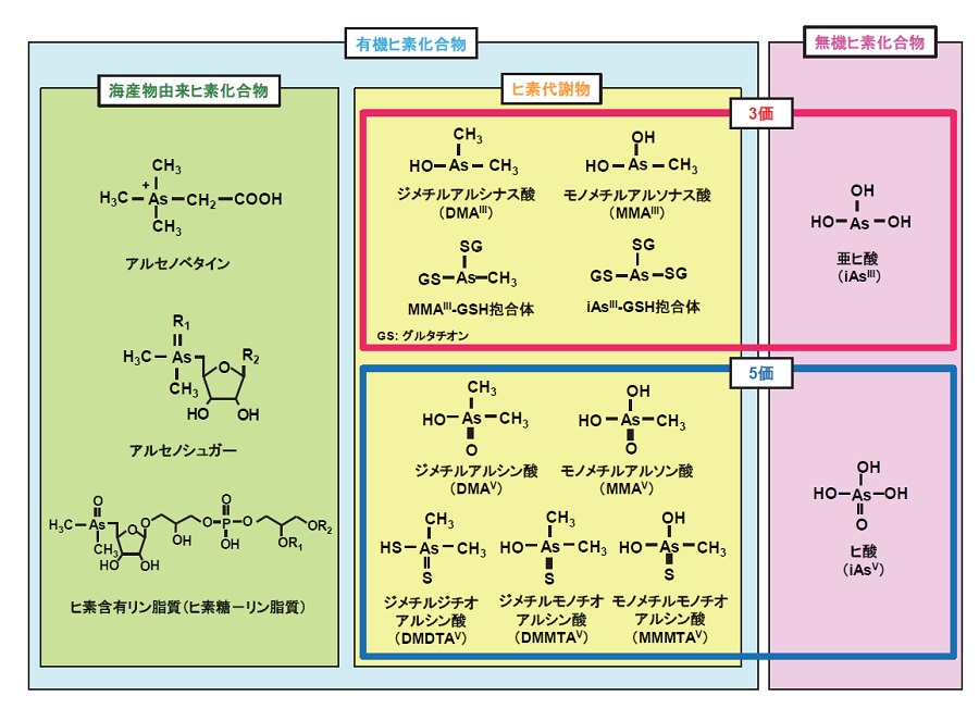 飲料水には主に無機ヒ素化合物が含まれています。生体内に摂取された無機ヒ素化合物はメチル化代謝されて、主として有機ヒ素化合物である5価のジメチルアルシン酸(DMAV)やモノメチルアルソン酸(MMAV)として尿中に排泄されます。米国国立労働安全衛生研究所が1976年に公表したラットを用いた毒性試験では経口投与でiAsIIIではLD50が41 mg/kg、MMAVでは790 mg/kg、DMAVでは2,600 mg/kgとなっています。このように、尿中に排泄されるMMAVやDMAVの毒性がiAsIIIよりも低いことから、メチル化はヒ素の解毒機構であると考えられてきました。ところが、代謝の過程で生成する有機ヒ素化合物のモノメチルアルソナス酸(MMAIII)やジメチルアルシナス酸(DMAIII)の毒性がiAsIIIよりも高いことが報告されたことから、近年、メチル化代謝はむしろ代謝活性化機構であると考えられるようになってきました。また、ヒ素汚染地域の住民の尿からはジメチルモノチオアルシン酸(DMMTAV)などの含硫ヒ素化合物が検出され、DMMTAVは5価の有機ヒ素化合物でありながら、無機ヒ素化合物よりも毒性が高いことが報告されています。この他にも、動物実験の結果から有機ヒ素化合物である3価ヒ素化合物-グルタチオン抱合体が胆汁中に排泄されることが明らかとなっています。このように、高性能の分析機器の開発や分析技術の進歩から無機ヒ素化合物の代謝過程において、生体内で様々な中間代謝物が生成することがわかってきました。