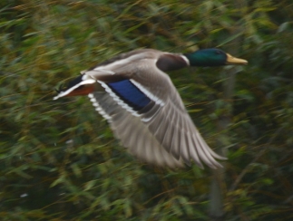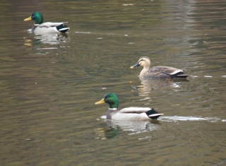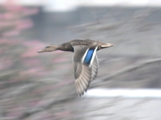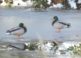 植物や昆虫の観察にはややオフシーズンとなる冬も、鳥を見るにはよい季節です。秋が深まり落葉樹が葉を落とすと樹上にとまる鳥を見つけやすくなります。また、冬を越すために北からわたってくる鳥、山から降りてくる鳥の姿も見られます。環境研の池では、一年を通じてカルガモが泳いでいますが、秋が深まるころには大陸からわたって来たマガモを時折見かけます。写真1の頭の緑色が目立つ2羽がマガモのオス、くちばしの先だけ黄色い一羽はカルガモです。写真2は、寒さがひときわ厳しいころ、凍った池の氷上にたたずむマガモの姿です。オスに比べてメスは地味な配色ですが、オス、メスとも翼を広げると青い羽根が目立ちます(写真3,4)。カモの仲間は翼のこの部分に目立つ色の羽根があるものが多く、翼鏡(よくきょう)と呼ばれます。