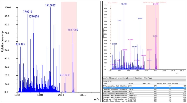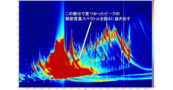 図3は、GCxGC-HRTOFMS測定により実際に得られた大気中の化学物質のトータルイオンクロマトグラム(TIC)です。TICとは、ある保持時間において見つけられた成分に由来するマススペクトルのイオンの和を表します。ここで、図3の横軸は1本目のキャピラリーカラムの保持時間(分)を、縦軸は2本目のキャピラリーカラムの保持時間(秒)を示しており、1つの成分に相当するTIC範囲は、横軸方向に2~3秒間、縦軸方向に0.05~0.5秒間です。色の違いは、見つけられた化学物質の濃度を表しており、濃い暖色であるほど何らかの化学物質が高い濃度で見つけられたことを意味します。本来、各ピークの幅は数秒程度と非常に狭いのですが、多数のピークが存在するためにTICの全体に赤色や黄色といった暖色の部分が目立っています。図4は、図3のTICについて、ある保持時間(中央部、黒丸)で見つけられた成分の精密質量スペクトルを抜き出したものです。その結果、図4の左図では、塩素を含む化学物質に特有のマススペクトルパターンが質量数230から300の範囲で確認されました。