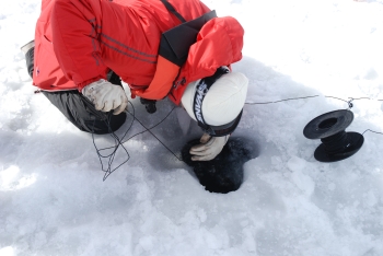 近ごろは、冬の摩周湖を訪れる方もたくさんいます。スノーシューと呼ばれる洋式のカンジキをはいて、雪におおわれた真冬の尾根道を散策するガイドツアーも人気です。冷え切った青黒い湖面、透明な薄氷がキラキラと太陽の光を反射するさまなど、冬場の摩周湖の表情はさまざまです。湖面が完全に結氷すれば、真冬の調査も可能になります。ただし、すべての観測機材を背負って崖を降りて行かねばなりませんが……。観測地点に到着し、氷に開けた穴から透明度板を降ろすと、ボートからの観測時のような揺れがないため、透明度板はどこまでもまっすぐ降りて行きます(写真2)。しまいには、水に映る自分の瞳の中に青白い透明度板がすっぽりと入り込んでしまいます。