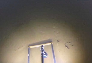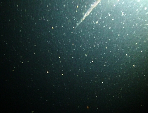 成分の化学分析ばかりでなく、湖水や湖底を直接観察できれば、別の発見があるかもしれません。手のひらに乗るほど小型の民生用ビデオカメラと耐圧容器を組み合わせることで、比較的安価に水中の様子を探ることができるようになってきました。2014年に朝日新聞と共同観測をおこなったところ、全く光の届かない世界である水深200 mの水中に、多数の粒子が漂っていることが観察されました(写真3 a)。プランクトンの死骸の固まりをはじめ、木の葉の破片などからなる粗大粒子が、湖底に向けてゆっくり沈降している様子を目の当たりにすると、これらの粒子の量的な把握や水中・湖底での挙動など、新たなチャレンジの意欲がわいてきます。今回の観測では、もう1つ大きな謎が見つかりました。水深210 mの湖底に、タイヤ痕のような規則正しい模様が見つかったのです(写真3 b)。カメラには生き物の姿は映っていませんが、摩周湖に生息する大型動物は、魚類のほかはウチダザリガニしかいません。なぜ、こんな深いところに生き物がいるのか、どんな生態なのか、浅いところに生息する個体とくらべて、種々の汚染物質が異なる濃縮傾向を示すのかなど、新たな興味がつきません。