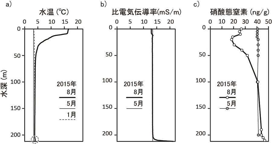 このような高精度測定技術を必要とする項目だけでなく、高感度測定法によってはじめて検出される項目もあります。たとえば、水中の溶存水銀については、パージトラップ原子蛍光法という方法によって、ようやく0.1 pg/g(10兆分の1)レベルの低濃度の水銀分布が得られるようになってきました。生物生産や透明度に深く関連するリン酸や硝酸といった栄養塩についても、従来の一般的な吸光光度法では検出できませんでした。これらも、濃縮法の開発やICP質量分析法の進歩などにより、次第に定量できるようになりました。図1 cに溶存態硝酸イオンの深さ方向分布を示します。5月から8月にかけて、植物プランクトンなどの生物に取り込まれ、硝酸濃度が大きく減少していることが分かります。逆の見方をすれば、ひと冬を越した翌春になると、生物からの分解や雨などの供給により、ふたたび硝酸濃度は元に戻ることになります。