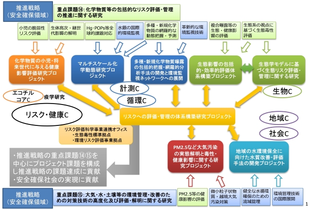 本研究センターで行う中心的な研究は安全確保研究プログラム(図)になります。この研究プログラムは「環境研究・環境技術開発の推進戦略について」(平成27年8月20日中央環境審議会答申)のうち、重点課題(14)化学物質等の包括的なリスク評価と管理の推進に関する研究に応える、(1)化学物質の小児・将来世代に与える健康影響評価研究、(2)多種・新規化学物質曝露の包括的把握・網羅的分析手法の開発と環境監視ネットワークへの展開、(3)生態学モデルに基づく生態リスク評価・管理に関する研究、(4)生態影響の包括的・効率的評価体系構築、(5)マルチスケール化学動態研究、及び重点課題(15)大気・水・土壌等の環境管理・改善のための対策技術の高度化及び評価・解明に関する研究に応える(6)PM2.5など大気汚染の実態解明と毒性・健康影響に関する研究、(7)地域の水環境保全に向けた水質改善・評価手法の開発、および全体をとりまとめる(8)リスクへの評価・管理の体系構築研究の8つの研究プロジェクトによりからなる研究を行います。環境リスク・健康研究センターが主な課題を担いつつ他の複数の研究センターと共同で実施しますが、うち特に(7)と(8)は地域環境研究センターが中心となって実施します。プログラム研究の成果により、持続可能な開発に関する世界サミット目標(WSSD2020年目標)の達成と大気汚染対策、健全な水循環の達成への貢献、さらに2020年以降の持続可能な安全確保社会に向けた貢献を目指します。