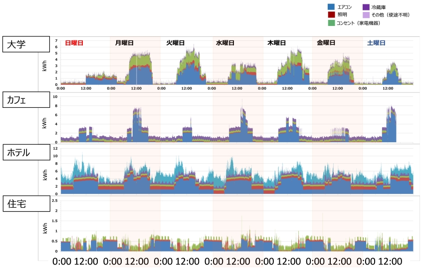 実際に電力消費量のモニタリングを開始したところ、図5のように施設ごとに異なる特徴があることが見えてきました。例えば大学やカフェでは平日の日中(業務時間中)の電力消費が中心ですが、ホテルでは日中に加えて宿泊客の滞在する夜間もある程度の電力消費があることが分かります。他方、住宅では日中は職場や学校に行っていることもあり電力消費量は低く、朝及び夕方が中心になっていることが分かります。このように、一口に「家庭部門」や「業務部門」といってもエネルギー消費の実態は世帯や施設の種類ごとに大きく異なり、それぞれに適した省エネルギー方策は異なることが分かってきています。今後は、これらの特徴をもとに、どのような省エネルギーが効果的かを分析・提案し、実施してみることでその効果を確認することを予定しています。