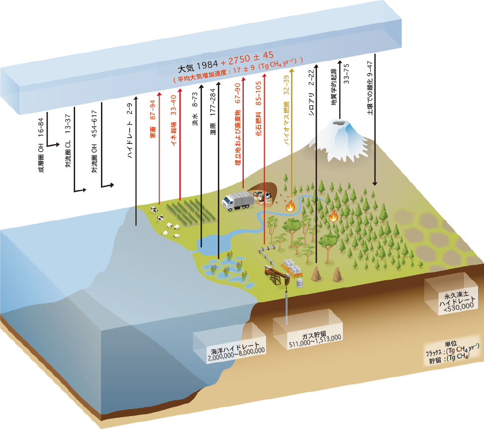 メタン(CH4)は、人為的な地球温暖化に対して二酸化炭素(CO2)に次ぐ寄与を持っており、そのグローバルな収支を理解することは非常に重要です。大気中でメタンが増加すると、それ自体の温室効果に加え、対流圏のオゾンや成層圏の水蒸気への影響を介した間接的な効果がはたらきます。そのため、過去の温度変化へのメタンの寄与を合計するとCO2の約58%にも相当すると考えられています。またメタンは、30億年ほど前には地球大気の主成分の1つだったという説があり、現在でも天然ガスとして人間社会に欠かせない資源であるなど注目すべき性質を持っています。ここでは現在のグローバルなメタンの循環と、それに関係する研究課題を説明します。