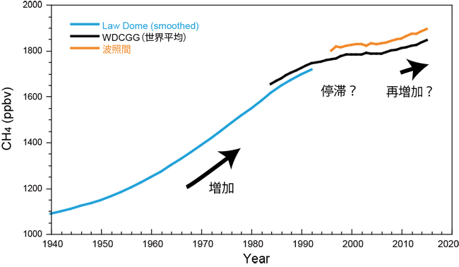 グローバルなメタン収支のあらましは上記の通りですが、未解明な部分はたくさん残されています。近年の大きな謎は、1990年あたりから大気中のメタン濃度の上昇速度が大きく十年規模で変動している点です(図3)。1980年代までは、放出量の増加に伴って比較的単調に増加していました。それが1990年代に入った頃から顕著に増加速度が鈍り、一時は減少に転じたことすらありました。その考えられる原因は、放出量の減少、消滅速度の増加、あるいはその両方ですが、まだ結論は出ていません。これまで観測やモデルを用いて様々な仮説が検討されており、メタン発生源の違いを反映する同位体比の測定データに基づいて化石燃料や水田からの放出量が減少してきたことが示されていますが、決め手に欠いています。というのも、湿原など自然起源の変動には大きな不確実性が残されているためです。実際、2007年頃から大気中のメタン濃度は再び増加に転じていることが観測されていますが、それを人為起源だけで説明することは困難です。近年の産業活動が目覚ましい中国やロシアなどの国々からの排出量は増加してきた可能性が高く、しかもその推計値に大きな誤差があることが指摘されています。別の不確実要因は、北半球の高緯度に分布する広大な湿原やツンドラからの放出量です。これらの多くは永久凍土上に分布しており、温暖化に伴う凍土の融解が予期せぬ大量のメタン放出につながることが危惧されています。西シベリアやカナダのハドソン湾岸の低湿地は現在も大きなメタン放出源となっており(図2)、気候変動がどのような影響を与えるかが注目されます。一般に温度上昇は微生物活動を活発化するのでメタン放出は増加しそうですが、気候の変化状況によっては降水量が減少し乾燥することで湿原そのものが失われる場合も考えられます。さらに、近年、メタンに関連して注目されるのがメタンハイドレートです。低温高圧下では、メタンは水とともにシャーベット状のメタンハイドレートになって存在します。地球上では、その多くはアクセスが困難な深海底にあると考えられます。日本のように化石燃料に乏しい国では、それでも資源として採掘の可能性が探られています。ところが、北極海の比較的浅い海底に存在するメタンハイドレートのうち一部が不安定化し、海水を経て大気に放出されている可能性が指摘されています。古気候の研究によると、数万年スケールの気候変動の中では、メタンハイドレートの大量放出が急激な温室効果をもたらした事例があるとされます。しかし、今後数十年程度の温暖化の中でどのような挙動を示すかを予測することは難しいのが現状です。IPCCなどの温暖化予測で用いられる地球システムモデルでも、最近はメタン収支の変動が気候に与える効果(フィードバック)を導入する方向ですが、ここで述べたような不確実要因の存在が大きな問題となっています。