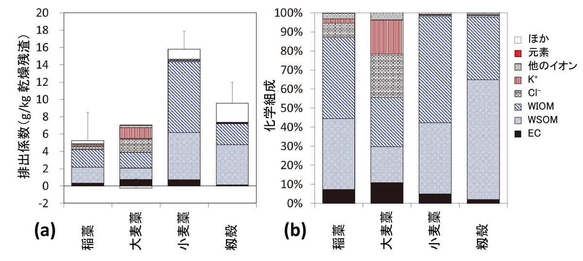 日本では藁だけでなく籾殻もしばしば野焼きされていますが、本研究によって、籾殻の野焼きによる粒子の排出係数と化学組成の情報を初めて示すことができました。本研究による稲藁の野焼きによる粒子の排出係数は、日本の排出インベントリー(排出量情報)で用いられてきた文献値(米国環境保護庁)と同程度でしたが、大麦藁は文献値の方が1.4~1.9倍と大きく、逆に小麦藁は文献値の方が0.3~0.4倍と小さいことが確認されました。排出係数にはこのような変動があるため、排出インベントリーでは、より現実に近い排出係数を用いたり、排出量の推計の幅を示すなどが今後必要だと思われます。