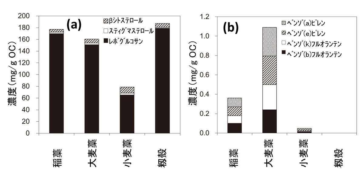 野焼きによる微小粒子状物質の排出係数と主な化学組成を図2に、いくつかの有機成分の濃度を図3に示します。小麦藁と籾殻ではECや多環芳香族炭化水素(PAHs)の比率が非常に低いことが明らかになりました。これは、小麦藁は他の藁より細く、籾殻は小さいので密に積み重なり、空気が十分供給されず、ゆっくり燃焼するためと考えられます。また、野焼きの寄与を推定するための指標成分としてしばしば用いられてきたカリウムの濃度は、燃やす残渣の種類によって2桁近く異なる一方、藁などの繊維質を構成するセルロースの熱分解で生成するレボグルコサンの濃度は変動が3倍程度以下と小さいことが明らかになりました。そのため、CMBなどの起源解析においては、指標成分にカリウムを用いるよりもレボグルコサンを用いた方が推定の精度が高まると考えられます。さらに、100種以上の有機成分の測定結果から、CMB解析用の発生源プロファイル(組成データ)を、日本産の農作物について初めて作成することができました。燃焼状態と化学組成の関係を解析した結果、炎をあげてよく燃えている時ほど排気粒子中のECやカリウム、PAHsの比率が上がり、逆にOCやレボグルコサンの比率は下がることが示されました。