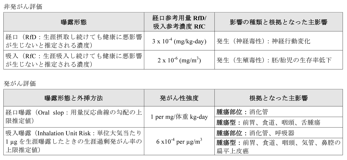 ベンゾピレンは、わが国における有害大気汚染物質の優先取組物質の一つに指定されている物質です。大気汚染防止法において「有害大気汚染物質」は、「継続的に摂取される場合には人の健康を損なうおそれがある物質で大気の汚染の原因となるもの」(第2条第13項)、すなわち低濃度長期間曝露における有害性(長期毒性)に着目して定められています。その中で健康リスクがある程度高いと考えられ、特に優先的に対策に取り組むべき物質(優先取組物質)として23物質が選定されており、ベンゾピレンは、その一つです。アメリカ合衆国では、環境保護庁(U.S. EPA)の統合リスク情報システム(IRIS)1) が、ようやく2017年に最終報告書を公表し、ベンゾピレンは「ヒトに対する発がん性(carcinogenic to humans)がある」物質とされました。さらに、同機関では、発がん性以外の毒性についても神経毒性、生殖毒性及び免疫毒性についての評価も行われました(表1)。欧州化学物質規制機関REACH/ECHA2)では、2016年に健康に対する高懸念物質の候補として、ベンゾピレンを登録しており、発がん性、変異原性及び生殖毒性(Carcinogenic, Mutagenic, Toxic for reproduction)を示す物質とされています。世界保健機関(WHO)の国際がん研究機関(IARC)3) のモノグラフでは、すでに、ヒト発がん物質(human carcinogen)として、グループ1となっています(http://monographs.iarc.fr/ENG/Classification/index.php, p. V100F P137-138)。動物実験の実施機関であるアメリカ合衆国国立衛生研究所/国立環境健康科学研究所NIH/NIEHSが運用している国立毒性プログラムNTP (National Toxicology Progaram) 4) においても、動物実験からの十分な発がん性の証拠に基づいて、“human carcinogens”とされています。このように、各評価機関によって微妙に表現は異なりますが、ベンゾピレンはヒトに対して遺伝毒性(変異原性)を有する発がん性物質であり、非発がん性については、生殖毒性、免疫毒性及び神経毒性を有する物質であると評価されたことになります。