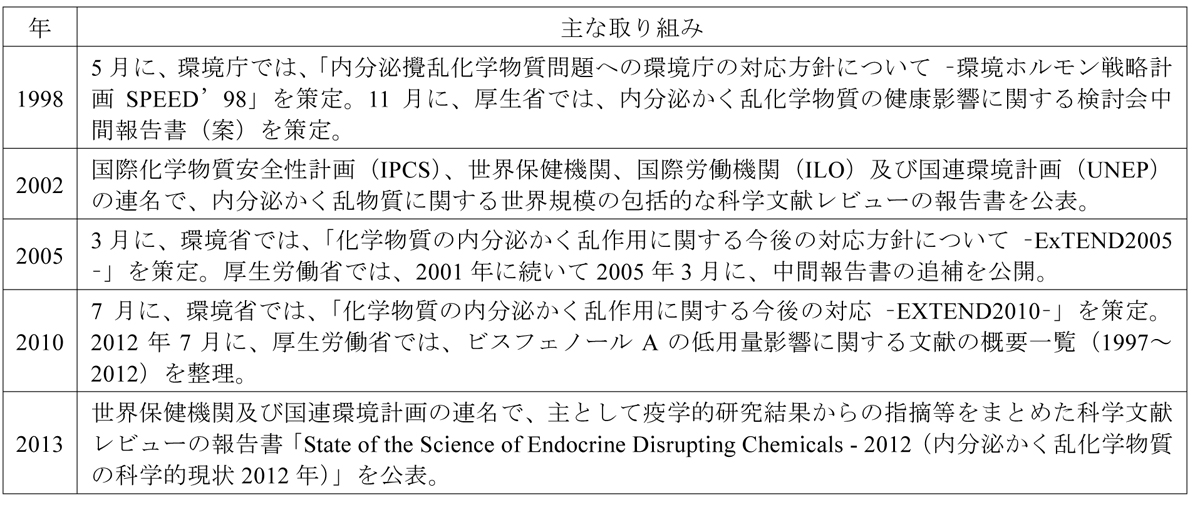 一方、BPAを含む内分泌かく乱化学物質については、EPA-IRISにおける再評価の報告は行われていませんが、2017年1月に免疫寛容への影響があることで、REACH/EHCの高懸念物質の候補として登録されました。REACH/ECHAの高懸念物質の候補表109物質中においては、これまでに内分泌かく乱作用が懸念される物質として、10物質(環境:7物質、ヒト:4物質)がリストアップされています(表2)。ヒトへの影響が明確に示されなかったことから、健康影響の是非をめぐって長い間議論されて、多くの研究や行政的取り組みがなされました(表3)。内分泌かく乱物質は「内分泌系の機能に変化をもたらし、その結果として未処置生物、子孫、(準)個体群に有害な健康影響をもたらす外因性の物質または混合物」と定義され、発がん性評価が中心であった健康影響研究の分野に、ホルモンのように低用量で長期間曝露し、影響を及ぼす物質の概念的な整理が行われました。この約20年間のあいだに、低用量での影響の標的が多岐に渡るため、影響を検出するのに多くの疫学研究、動物実験、メカニズム研究が必要であったため、そのあゆみには時間がかかりました。その研究の中心的な内分泌かく乱化学物質の一つがBPAです。