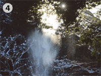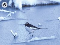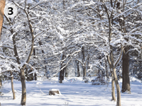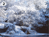 つくばでも時折雪が降ります。前日からの雪が降りやんで晴れた朝には、美しい世界が見られます。研究所の正門を入って本館に向かう道には雪で飾られたユリノキが並んでいます(写真 1)。池の端のイロハモミジはまったくちがう枝ぶりです(写真 2)。林のなかはちょっとした雪国の風情があります(写真 3)。朝日が射すとともに樹上の雪がゆるんで落ちてきます。雪が散りながら陽射しを受けるようすは光のシャワーのようです(写真 4)。ところで、環境研の構内にはノウサギがいます。ふだん、なかなかその姿は見られませんが、林の中で雪を見渡すと、きっとどこかでノウサギの足跡が見つかります(写真 5)。また、凍った池に雪が積り、そこをセグロセキレイが歩き回る様子は、動く水墨画といった趣です(写真 6)。こうした別世界も、太陽が雪を溶かすとともにその輝きを失っていきます。限られた時間だけの楽しみです。