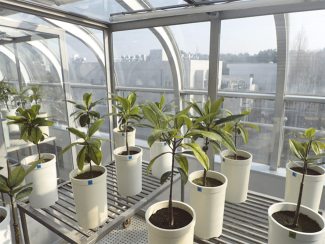 さて、温暖化による気温上昇は、生き物のあらゆる機能に影響を及ぼすことが予想されます。マングローブ植物も例外ではないでしょう。現在すでに暖かい熱帯・亜熱帯がさらに温暖化した場合、マングローブ植物はどの様な影響を受けるのでしょうか?気候変動適応策としてのマングローブ植林を推進する上でも、温暖化した将来に植物が受ける影響を把握しておくことは重要です。私たちの研究プロジェクトでは、国立環境研究所の大型研究施設である自然光チャンバーを用いて、気温上昇がマングローブ植物の生育へ及ぼす影響を調べています(写真4)。自然光チャンバーは温度と湿度のプログラム制御が可能で、気温が高くなった世界をチャンバーの中に再現することが出来ます。アジア・太平洋地域のマングローブの主要な構成樹種をポットに植えて、数段階の気温に設定したチャンバーで栽培し、成長速度や形態変化、光合成や呼吸速度などを計測しています。今後、温暖化でマングローブ域にどの位の気温上昇が起きるのか未知ですが、例えば、夜間でも35℃を下回らないような世界が来たとすると、ヤエヤマヒルギやオヒルギは枯れてしまうようです(図1)。また、同じヒルギ科でもヤエヤマヒルギとオヒルギでは高温に対する耐性が異なるようです。私たちの研究プロジェクトでは、この様な種差を生み出しているメカニズムについても、植物種ごとの生理特性に着目しながら調べています。世界のマングローブで見られる植物種はおよそ100種あります。一つ一つを調べて行く方法もありますが、現象を引き起こしているメカニズムが明らかになることで、環境変動に対するマングローブ生態系の応答を予測する高度なモデルへの応用といった飛躍的なアプリケーションが可能になると考えています。