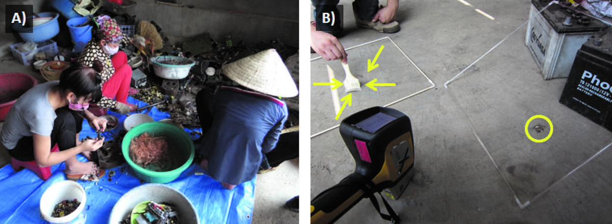 ベトナムの首都ハノイの南東30kmに位置する人口3,000人ほどの小さな村、ブイザウ。のどかな水田風景の中を進み集落に差し掛かると、周りの景色が一変し、古いテレビやパソコン、電線コードやプリント基板が山積みになっている住宅や倉庫が姿を現します(写真1A)。かつてこの村の人々は農業によって収入を得ていましたが、2000年頃から使用済みとなった電気製品(E-waste)に含まれる有価物(鉄、銅、アルミ、プラスチックなど)を集めて収入を得る人が増えていったといいます。ただ、日本国内の家電リサイクル工場のように作業環境や周辺環境に配慮した作業を行っているわけではありません。村の人々は、細かな金属片やプラスチック片、古い電気製品の中にたまっていた埃など(ダスト)に毎日曝露されています(写真1B)。E-wasteのダストの中には、プリント基板のはんだに使われる鉛などの重金属、プラスチックを燃えにくく加工するために使われる難燃剤、特定の臭素系難燃剤の製造時と使用中に、極微量ながら非意図的に生成される臭素化ダイオキシン類が高い濃度で溜まっていることが明らかになっています。鉛は、低い濃度でも小児の認知機能の発達や学習に悪い影響を与える可能性があります。特定の臭素系難燃剤は、動物実験で甲状腺ホルモンを減少させる可能性が指摘されており、臭素化ダイオキシン類は、がん発生の促進、甲状腺機能の低下、生殖器官の重量や精子形成の減少、免疫機能の低下などに関係することが懸念されています。村の人々は、口元にタオルを当てたり、マスクや手袋をつけたりしていますが、とても簡易な防護方法なため、有害性が明らかな鉛や臭素系難燃剤、臭素化ダイオキシン類を呼吸や皮膚から毎日のように摂り込んでいるかもしれません。