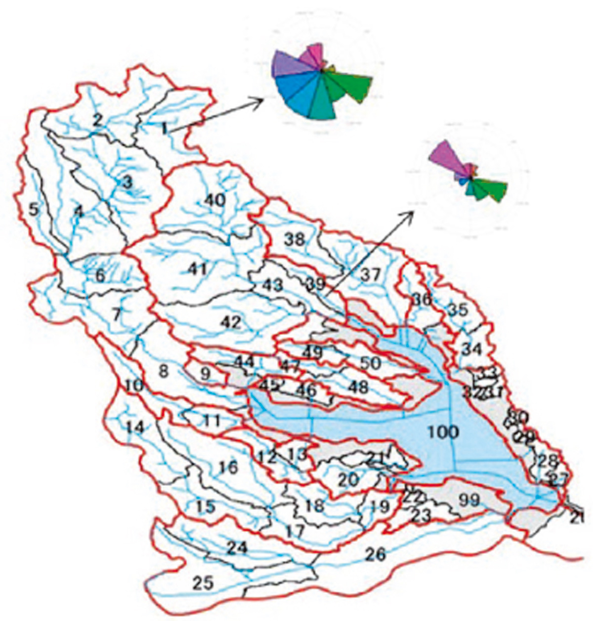 関東平野に位置する霞ヶ浦の流域は広く、山地のほかに農地、市街地など様々に利用されています。私たちのプロジェクトでは、約50 km四方におよぶ霞ヶ浦流域を50に分割した各流域において、10の生態系サービスと生物多様性を定量化しています(図1)。生態系サービスのデータは文献やデータベースから収集していますが、なかでも各流域の情報が不足している水質と生物多様性については、本プロジェクトで実際に観測しています。これほど広範な地域でこれだけの生態系サービスと生物多様性の関係性を解析するには大きな労力がかかるため、世界でも研究例は限られており、貴重な結果が得られると考えています。