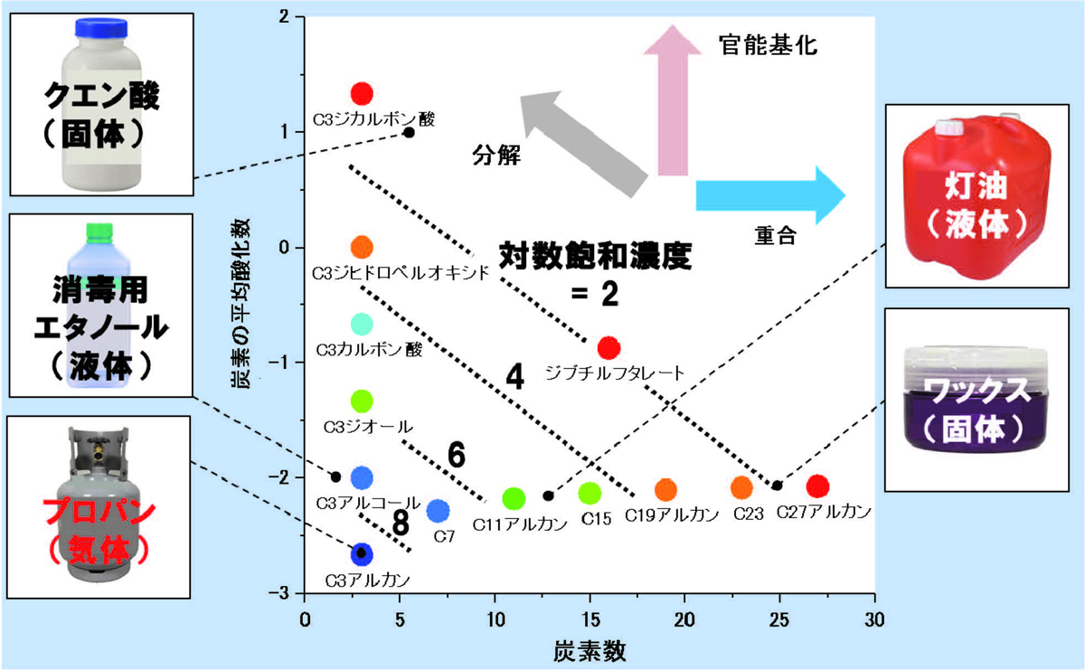 大気中には多様な有機化合物が存在します。ある有機化合物の存在量が飽和濃度を超えると、その有機化合物はガスと粒子の混合状態になります。これは水蒸気の存在量が飽和水蒸気量を超えると水蒸気と水の混合状態になるのと似ています。飽和濃度は有機化合物の種類によって異なります。有機化合物の種類と飽和濃度の関係を知るには、有機化合物中にある炭素数を横軸に、炭素の平均酸化数を縦軸にとった2次元マップ上で飽和濃度がどのように変化するか調べるのが便利です(図1)。