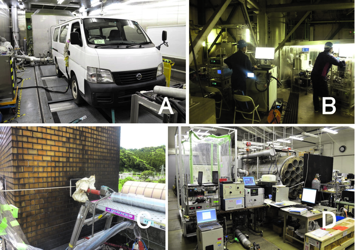 ディーゼル車、一般廃棄物焼却炉および下水汚泥処理施設(A重油燃焼)から排出されたPOAの飽和濃度分布を測定しました(図2A~2C)。各発生源からの高温の排気を流通容器内で精製空気によって希釈し、常温になった状態で測定を行いました。