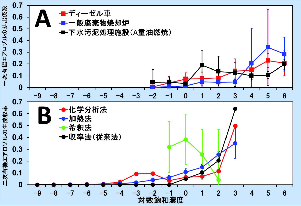 A:一次有機エアロゾル(凝縮性粒子)の結果。2018年に発表された環境リスク・健康研究センターの藤谷雄二らによる環境研究総合推進費終了研究成果報告書(5-1506燃焼発生源における希釈法による凝縮性一次粒子揮発特性の評価法の確立、2015~2017年度)からデータを引用しています。