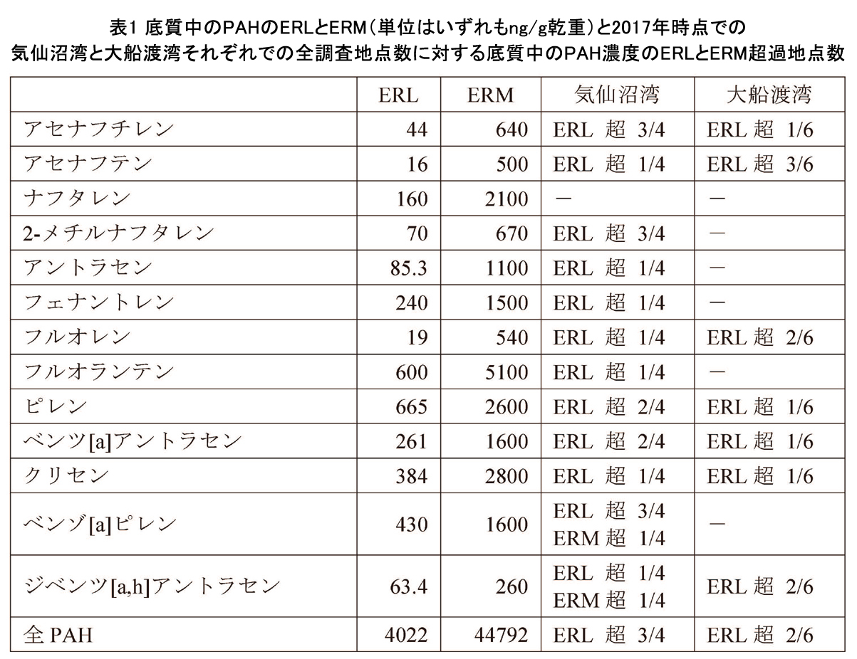 経時的な変化では、難分解性のPAHも震災から時間が経つにつれて確実に減少しており、直近(2017年時点)では最高濃度時の2~6%まで減少していることが示されています(図2)。底質中のPAHの環境基準値は存在しませんが、PAHの中にはベンゾ(a)ピレンのように発がん性を有するものがあり、環境中に普遍的に存在する有害物質として注視されているために、米国海洋大気庁(NOAA)により「生物学的に10%、あるいは50%の確率で悪影響を及ぼしうる濃度範囲をそれぞれ “ Effect Range Law(ERL)”、あるいは “ Effect Range Median(ERM)”」として定められています。このERLとERMと直近の気仙沼湾と大船渡湾における底質中の各PAHの濃度との関係は表1のようになっています。かつては大部分の調査地点で表に指定されているほとんどのPAHの濃度がERL、あるいはERMを超過していましたが、2017年時点で大船渡湾ではERLを超過する地点が6箇所中1~3箇所でERM超過地点は無く、気仙沼湾ではERLを超過する地点が4箇所中1~3箇所でERM超過地点が4箇所中1箇所となっています。震災後の着実な環境回復が進んでいることが示されたと考えられました。