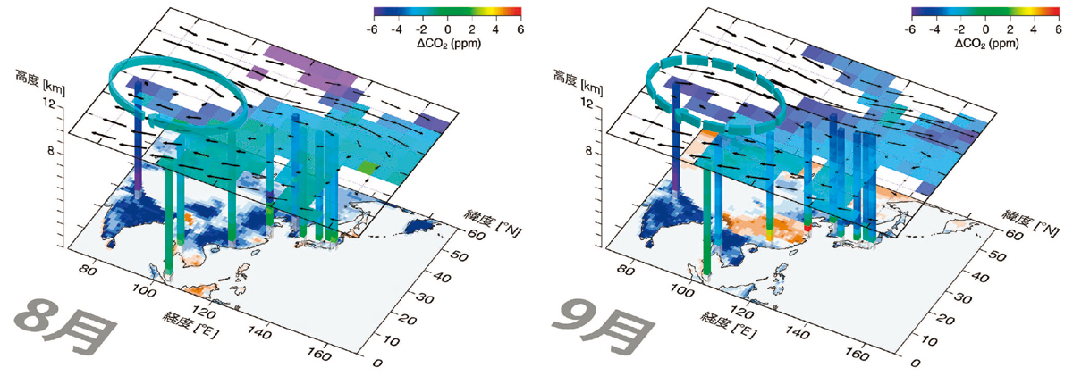 CONTRAIL観測は日本を拠点としており、また、CO2濃度連続測定装置を搭載できる機体がアジアの都市へ就航することが多かったことから、CO2濃度の観測データは日本を含むアジア地域上空で最も充実しています。そこで、アジア太平洋地域のCO2濃度の分布について、上部対流圏(高度10 km付近)での水平飛行と各空港上空での高度分布のデータを合わせて解析し、三次元的なCO2濃度の分布とその季節変動を明らかにしました。描き出されたのが図1です。継続的なCO2濃度の増加傾向を除去し、2005年から2015年の平均的な季節変動を8月と9月について図示しています。上面のパネルは高度10 km付近のCO2濃度の分布を、そのパネルを垂直に地表まで繋ぐ柱が各空港上のCO2濃度の高度分布を表しています。興味深いのは、インド上空の濃い青の柱です。下面パネルでインド亜大陸が濃い青になっているのは、アジアモンスーンの影響で雨季にあるこの地域の陸上植物が強いCO2吸収源となっていることを示しています。その上空の濃い青の柱で示されたように、この時期の活発な鉛直混合の効果によって、地表のCO2吸収による濃度減少の影響は高度10 km付近の上部対流圏にまで及んでいます。上面パネルの上部対流圏では、楕円の矢印のように、夏季のアジアモンスーンで生じる持続性の高気圧が南アジアから東南アジアに及ぶ循環を形成しており、その内側に直下の南アジアから上昇してきた低いCO2濃度の空気が閉じ込められています。この高気圧循環は9月になると弱まり、上部対流圏を通してその外側へとCO2濃度の低濃度領域が広がってゆきます。また、8月には陸上植物の光合成の活発化によって高緯度地域(シベリア)の上空で低いCO2濃度が見られていますが、この影響も徐々に南へと伝搬します。この結果、9月の日本を含む東アジア上空の柱を見ると、地表よりも上空でCO2濃度が低くなる高度分布が見られています。このように、アジア地域のCO2濃度の三次元的な時空間変動は季節的なアジアモンスーン循環と強く関係しています。