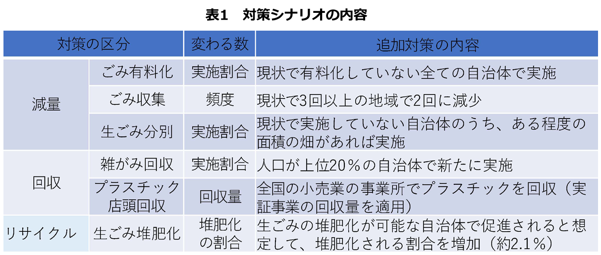 次に、将来シナリオについて説明します。一廃のフローを推計するためにはモデルに条件となる数値を入力しなければなりません。この条件は、予想したい社会の状態(シナリオ)によって違ってきます。まず、現在(研究を始めた時期により2015年としました)、未来(2030年)という2つの時点を想定し、2030年においては「BaUシナリオ」と「対策シナリオ」を想定しました。BaUシナリオは、2030年においても現在と同様の対策を実施するという想定です。BaUとはBusiness as Usualの略で、この場合は現状の対策状況のまま、といった意味です。一方、対策シナリオは、現在より対策が実施される自治体の数が増えたり、対策の量が増えたりする想定です。想定した対策は一廃の減量から分別回収、リサイクルまでを扱うもので、具体的な内容は、ごみ収集の有料化、生ごみの分別・リサイクル、プラスチックの店頭回収、生ごみの堆肥化などです(表1)。シナリオ間の違いについて「ごみ有料化」を例に説明すると、BaUシナリオでは2030年においても実施する自治体は現在(2015年)と同じですが、対策シナリオでは全ての自治体で実施することを想定しています。こういった対策の導入量については、既存研究[2]などを参考として設定します。また、将来の人口については、規模が小さい自治体ほど減少するという予測データを用いています。