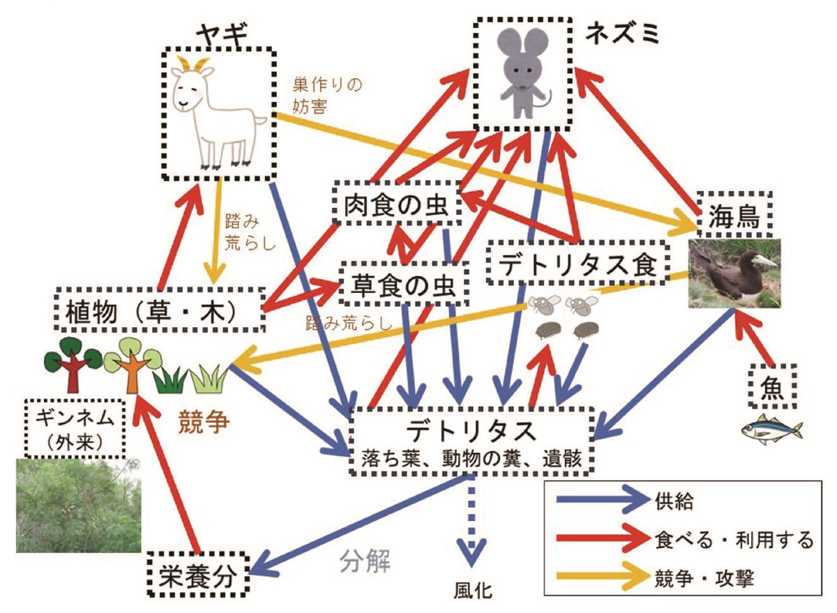 そこで私たちは小笠原諸島の媒島の物質循環を再現した生態系のシミュレーションモデルを作成しました。生態系の物質循環は、植物が土の中の栄養分を吸収して成長するところから始まります。小笠原諸島では、生態系に必要な栄養分の大部分は、海鳥が海で魚を食べ、島に帰って排泄することでもたらされます。栄養分を吸収して成長した植物を草食動物が食べ、さらにそれを肉食動物が食べます。食べると動物は糞をします。また、死んでしまうこともあるので遺骸も発生します。植物も同様で、日常的に枯葉が発生しますし、台風などで倒れて枯れてしまうこともあります。これら排泄物や遺骸をひとまとめにしてデトリタスと呼びます。生態系の中にはデトリタスを食べる動物もいます。デトリタス食の動物はまた肉食動物に食べられます。再利用されないデトリタスは、一部は風化して流れ去っていきますが、一部は分解され、また植物が利用可能な栄養分になって土の中に戻ります。媒島には侵入生物のヤギとネズミもいますが、両種とも広食性であり、ヤギはほとんど全ての植物を、そしてネズミはヤギ以外のほとんど全ての動植物を食べます。ところで、生態系には食う-食われるの関係以外の相互作用も含まれています。例えば植物同士は生える場所や光、栄養分などをめぐって競争します。ヤギはあちこちを踏み荒らすことで植物の生長や海鳥の営巣を妨害します。海鳥も巣の周りを歩き回ったり、巣穴を掘ったりすることで植物の生長を妨害します。また、多様性も生態系の重要な要素です。図2では、見やすさを重視して、植物、草食の虫などのようにひとまとめにして表されていますが、植物にもたくさんの種類があり、それぞれ多様な性質を持っています。栄養分が豊富ならば早く成長するもの、裸地があると早く成長できるもの、栄養分が少なくても日陰でも耐えられるものなどがあります。虫にも多様性があります。大きさはもちろん、餌の好みも様々で、特定のものしか食べないものや幅広く何でも食べるものもいます。今回私たちが作成した生態系モデルは、これらの全ての要素をまるごと取り込んで、なるべく現実に近いものになるように媒島の生態系をコンピュータの中に再現したのです。
