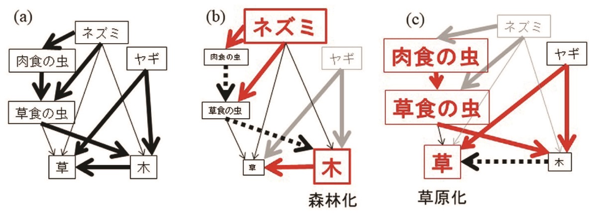 このモデルを用いて侵入種を駆除するシミュレーションを行いました。その結果、ヤギを駆除すると図3aの状態から図3bの状態への変化が起こることがわかりました。ヤギを駆除すると植物は食べられなくなります。ネズミは植物性の餌を独占できるようになるので、ネズミの数が増えます。その結果ネズミが食べている虫の数が減るのでこれも植物が食べられなくなる効果をもたらします。そのため、木と草の競争を邪魔するものが少なくなります。草は木よりも背が低く、木との競争には勝てません。その結果全島森林に覆われることになります。ネズミを駆除した場合は図3aから図3cへの変化が起こります。ネズミを駆除すると虫の数が増えますし、ヤギは相変わらず残っているので、その結果植物はもっと激しく食べられるようになります。この場合、成長の早い草の方が被害を受けにくいので、全島草原化することになります。