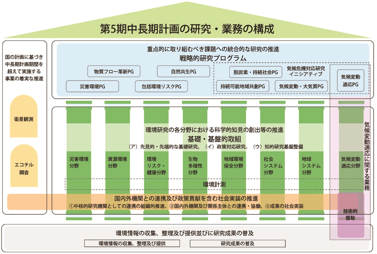 さらに、環境問題の解決に資する政策的・学術的な源泉となるべき科学的知見の創出のため、創造的・先端的な科学の探究を基礎とする研究から政策のニーズに対応した実践的研究、政策・学術を支援する知的基盤の整備、さらには社会実装に関わる事業的取組に至るまで、幅広い段階を含む基礎・基盤的取組を、各分野の下で連携も図りつつ体系的に実施することとしました。また、環境計測、観測手法の高度化等の先端的な計測研究は各分野での研究と一体的に推進し、環境計測の精度管理等に関する共通・基盤的な計測業務は分野横断的に推進することとしました。