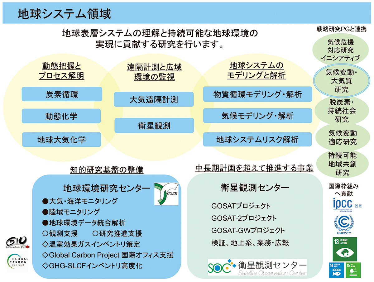前期までの地球環境センターでは、地球温暖化の現象解明、低炭素社会の実現といった社会のニーズに応える新たな研究に挑戦してきました。地球システム領域では、エアロゾルや雲、短寿命気候強制因子、窒素循環等の研究も充実させ、強い基礎基盤の上で地球環境の理解と予測、気候変動対策の効果の検証等に取り組んでいきます。