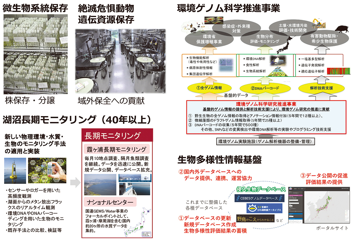 知的研究基盤整備(図1)として、生物多様性の評価と保全に必要な、湖沼等の長期モニタリング、生物応答に関する実験、生物のゲノム情報解析に関する研究基盤整備を行います。また、生物資源の収集・保存事業を行い、絶滅危惧種の域外保全に貢献するとともに、微細藻類をはじめとする生物資源の持続的利用を推進します。さらに、国内外の観測ネットワーク等と連携するともに、データや試料の利活用を推進します。