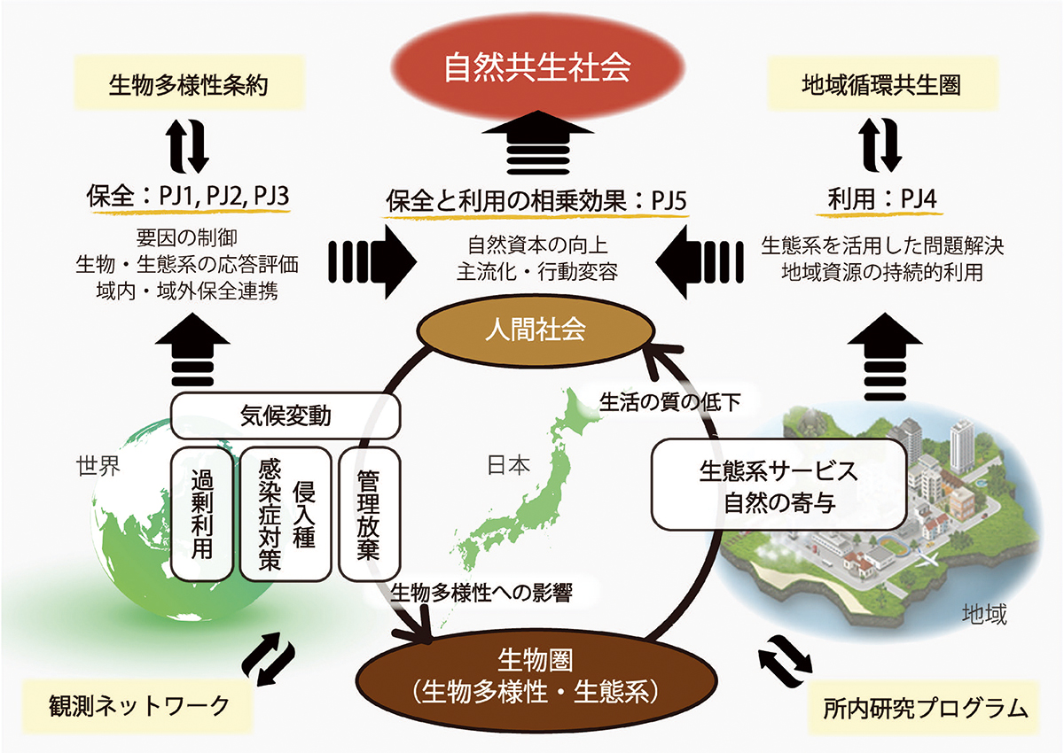 これら5つの課題に取り組むことにより、生物多様性の主流化および行動変容などの社会変革をうながし、生物多様性の保全と利用の相乗効果による自然資本の向上を目指します。生物多様性条約のポスト2020年目標へ貢献するとともに、利用に関して地域資源の持続的利用の観点で地域循環共生圏へ貢献します。