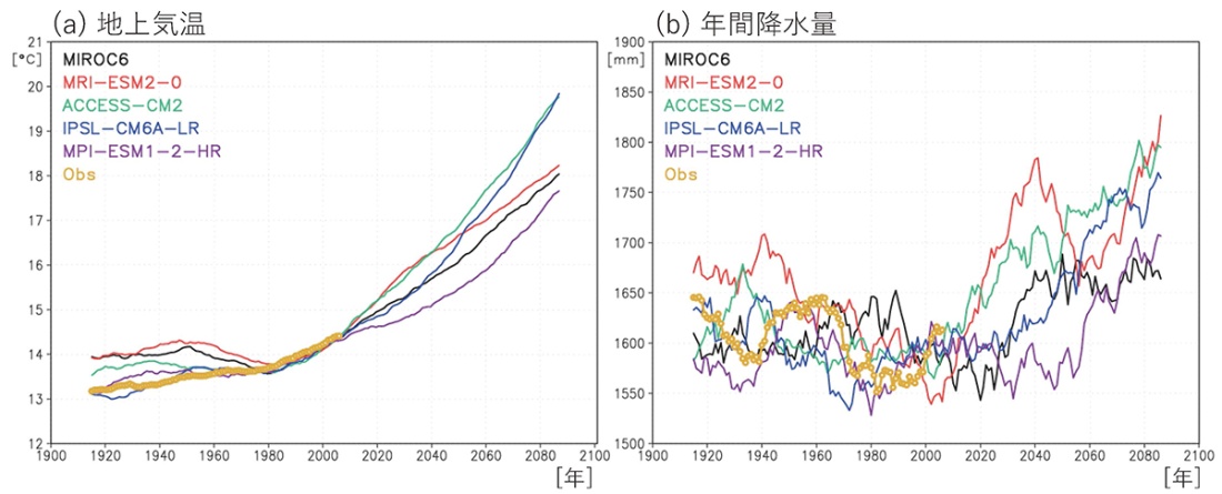 将来の気候を予測するには、地球全体を格子状に区切った全球気候モデルを使います。将来の全球の温室効果ガスの量の変化を仮定して、物理方程式を計算することで将来の大気の状態や気温、雨の降り方がどうなるかをシミュレーションするのです。全球気候モデルの性能を確認するため、過去の気候を再現するシミュレーションも行い、同時期の観測値と比較してモデルの改良に反映させます。全球気候モデルの再現性向上のために多くの研究者が尽力していますが、それでも過去の観測値と完全には一致しません。そのため、モデルの結果は相互に比較して再現性を確認しながら様々な現象の解析に用いられます。2011年頃から最近まで、気候変動に関する政府間パネル(IPCC)の第5次影響評価報告書に主に使われた第5期結合モデル相互比較プロジェクト(CMIP5)に提出されたモデルが広く使用されてきましたが、2020年頃から第6期結合モデル相互比較プロジェクト(CMIP6)のデータ公開が始まりました。