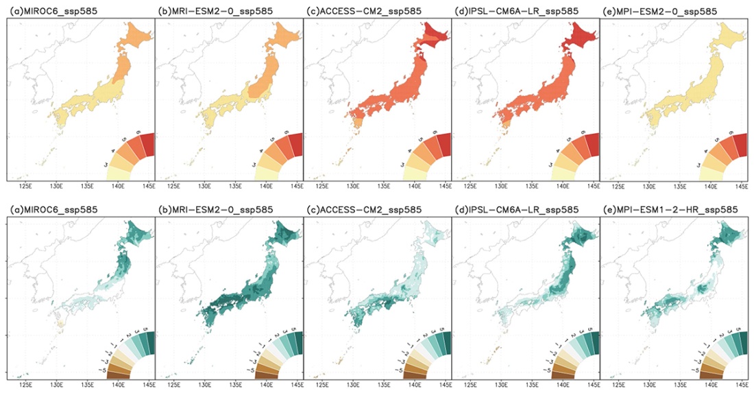 CMIP6には50を超える数の全球気候モデルがあり、それらをすべて解析することは困難です。2021年の塩竈氏らによる研究で、日本域における日平均、日最高、日最低気温、降水量など8つの気象変数について、将来変化の幅をできるだけカバーするサブセットの選択手法が開発されました。その手法に従って5つの全球気候モデルを選択し、空間解像度が1km、時間解像度が日別値の地域気候予測データを作成しました。この気候予測データを様々な影響評価に利用することで、異なる分野への気候変動の影響の大きさを比較することが可能となり、地域の適応策やその優先度を検討する資料として活用されることが期待されます。
