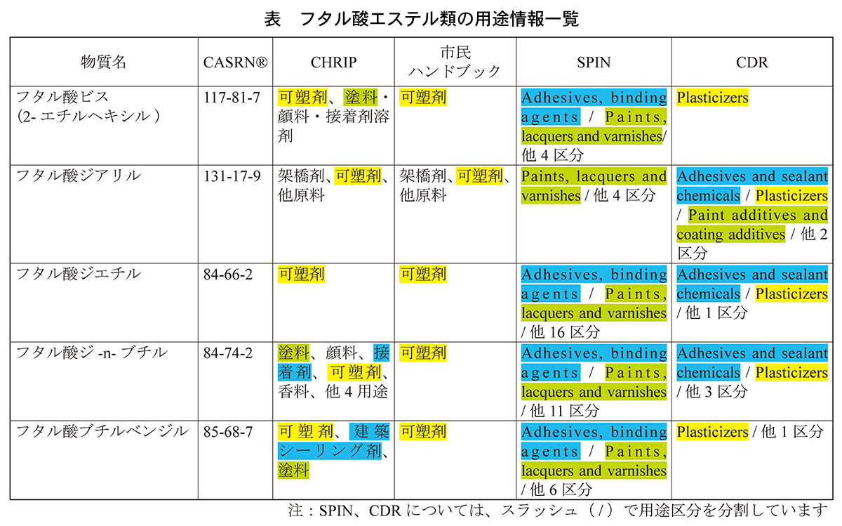 収集が困難なことに加えて、用途情報の収集・整理における別の課題・問題点を、可塑剤としての用途が有名なフタル酸エステル類を例として説明します。なお、用途の情報源としては、NITE-CHRIP(以下、CHRIP)(https://www.nite.go.jp/chem/chrip/chrip_search/systemTop)、PRTRデータを読み解くための市民ガイドブック(以下、市民ガイドブック)(https://www.env.go.jp/chemi/prtr/archive/guidebook.html)、北欧諸国のSubstances in Preparations In the Nordic countries(以下、SPIN)データベース(用途62分類)、米国のChemical Data Reporting(以下、CDR)データベース(うち、工業使用の用途36分類)を対象とします。国内の用途情報であるCHRIPと市民ガイドブックは自由記載で掲載されています。国内の情報源では用途が分からない物質についても検討対象にするため、またより多くの情報源を対象にした方が解析結果の信頼性が高くなると考え、国外の情報源も対象としています。フタル酸エステル類としてはPRTR対象になっている5物質を取り上げました。将来的には用途情報が少ない物質についても解析を広げる予定ですが、ここでは例として情報が豊富に存在する物質としました。各物質の用途情報一覧(一部、筆者による省略含む)を表に示します。様々な用途のうち、可塑剤、塗料、接着剤(シーリング剤含む)に着目し、それぞれ背景色で区別しました。SPIN以外では全て可塑剤(Plasticizers)が記載されていました。これはSPINでは可塑剤に該当する区分が存在しないことが原因でした。接着剤については、SPINでは“Adhesive, binding agents”、CDRでは“Adhesives and sealant chemicals”と微妙に表現が異なる上に、当該用途が記載されているかどうか物質によって異なり、国内の情報源とも明らかに差異がありました。塗料においても同様の傾向がみられました。収集した情報の国・地域が異なるため、実際に各物質の用途に相違があったのかもしれませんし、情報収集・整理方法や分類方法などに起因する情報源の特徴の違いによって相違があるのかもしれません。国内のCHRIPと市民ガイドブック間でも相違がありました。前者は出典元の用途情報を広く記載するという側面、後者は市民向け資料という側面があり、それらが両者の違いの原因だと考えています。このように“不整合”を含む用途情報をどのように利用して排出推定に結び付けるかが今後の課題となっています。