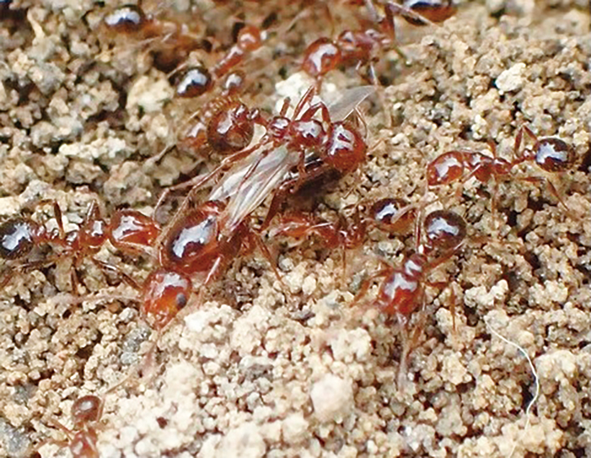 ヒアリの日本国内への侵入は、2022年1月現在で、18都道府県84事例を数えます。2021年は20事例と、2017年に次ぐ数に達しています。本稿では、この国内でヒアリの営巣が確認された場合の「定着後防除」のために私たちが進めている研究を主に紹介します。 過去の防除事例から、ヒアリの定着後防除には毒入りの餌(ベイト)剤と、液剤を用いた化学的防除が有効だと示されています。一方、アリ類を標的とした防除薬剤は近年多数開発されており、どの薬剤がヒアリに対して最も効果的かを検証することが望まれます。しかし、アリ類を対象とした定量的な薬剤効果の評価法は確立されていませんでした。そこで私たちは、アリ類に対する薬効評価試験の開発を検討しました。