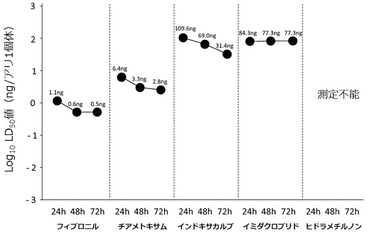 毒性試験を行うためには、まずアリへの麻酔が必要となります。予備実験の結果から、昆虫の麻酔によく用いられる二酸化炭素麻酔では、麻酔後のアリの死亡リスクが高いことが示されました。そこでアリの体への負担が低い麻酔法を検討した結果、氷冷により、アリを安全に長時間麻酔可能だとわかりました。採集した働きアリをこうして麻酔した後に、溶媒のアセトンで希釈した試験薬剤を胸部に1mLの1/1000ものごく微量、1µL滴下した上で、個別の容器に移します。移す際にも、アリに怪我を負わせないよう、バネ製の特殊なピンセットを用いました。このように丁寧に処理したアリを、個別の容器に移して、単位時間ごとに死亡個体数を測定することで、精密に半数致死量(LD50)値を算出する毒性試験法を構築しました。この系を利用し、私たちは定着後防除用液剤・ベイト剤の候補剤5種(フィプロニル、チアメトキサム、インドキサカルブ、イミダクロプリド、ヒドラメチルノン)について72時間までのLD50値を24時間ごとに算出し、薬効を比較しました(図2)。その結果、昆虫の神経伝達機構を妨げる殺虫剤であるフィプロニルのLD50値が他剤と比較しておよそ1/10から1/100と小さな値を示し、ヒアリに対して非常に強い薬効をもつことが示されました。これらの結果から、定着後防除を目的としたヒアリ防除用の液剤・ベイト剤に用いる薬剤として、現行剤であるフィプロニルが最も優れていることが強く支持されました。
