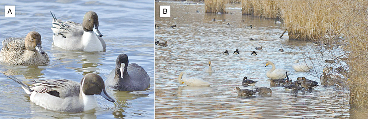 鳥インフルエンザウイルスの主要な自然宿主はカモなどの水禽類と考えられています。ご存知の方もいらっしゃるかもしれませんが、マガモやオナガガモなど多くのカモ類は渡り鳥です。実際にマガモだけでも毎年30万から40万羽が国内に飛来しています。したがって、一定の数の鳥インフルエンザウイルスに感染したカモ類が、体内にインフルエンザウイルスを保有したまま、日本各地に飛来します。図1は国内の調査地の写真です。カモ類の一つであるオナガガモの他、オオバン、オオハクチョウ、マガンなどが確認できます。この様な湖や池、沼で、鳥インフルエンザウイルスに感染したカモ類の糞を介して、他の野鳥への鳥インフルエンザウイルス感染が成立します。したがって、自然宿主であるカモ類の糞中に含まれる鳥インフルエンザウイルスの遺伝子検査は、国内に生息する野鳥の鳥インフルエンザの感染状況を把握する貴重な情報となります。この様に、遺伝子検査の様な分子生物学技術の発展は、今や生物多様性の保全に貢献する技術の一つとなっています。