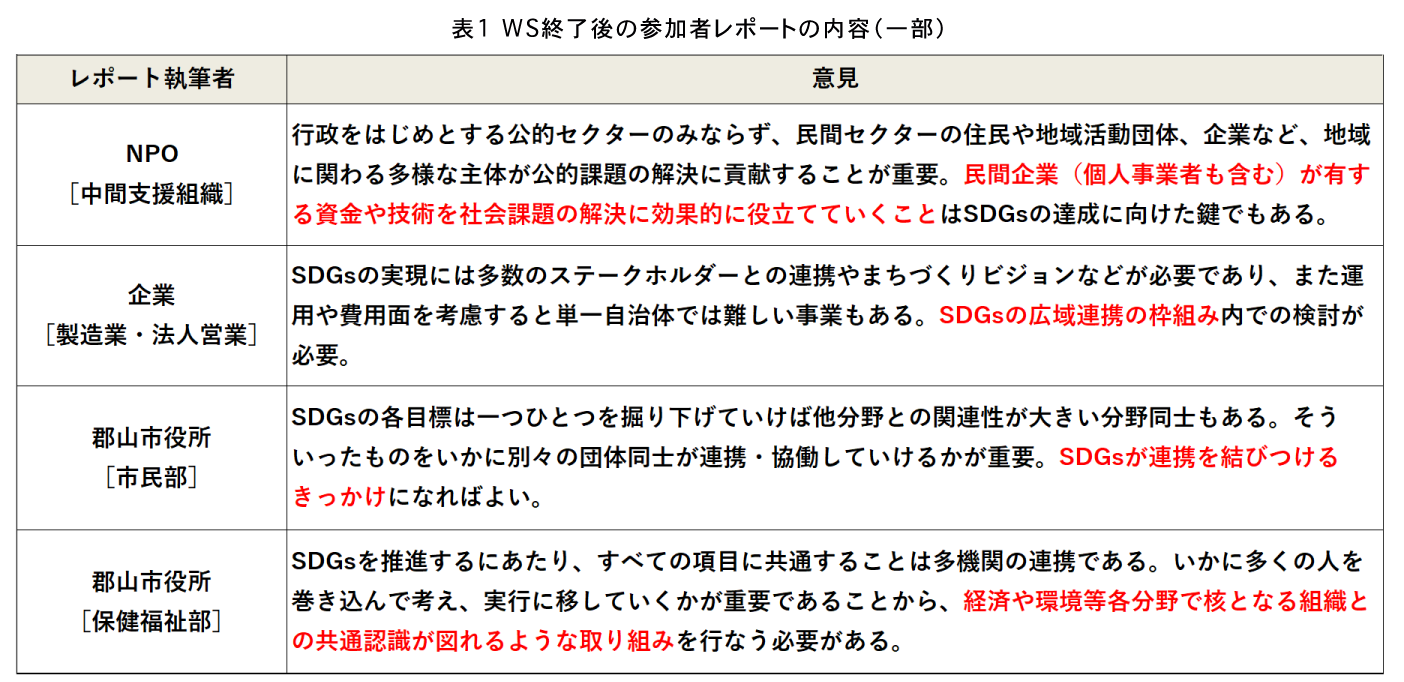 さらに私たちは全3回のWS終了後に、参加者から提出いただいたレポートを分析しました。レポートでは第3回WSの分析から抽出された8つの分野のうち、参加者が最も重視する分野を尋ねるとともに、郡山市におけるSDGsに関わる政策・活動に対する意見を自由記述で尋ねました。結果、最も多くの参加者が重視していたのは「8. 連携」でした(11名中5名)。自由記述では、SDGsが郡山市のまちづくりに関わる様々なSHを繋ぐツールになることへの期待、SDGsの達成に向けて様々なSHが協力して、各々の専門知識や資源を活用する必要性等が指摘されました(表1)。